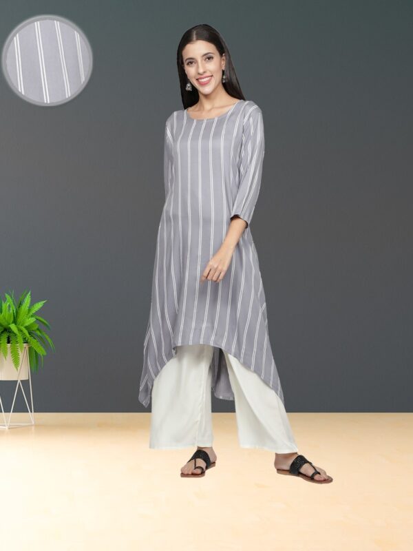 Fabclub Women Rayon Striped Asymmetric Flared Kurti (Grey)