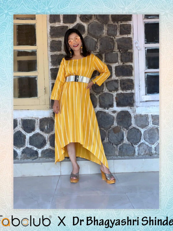 Fabclub Women Rayon Striped Asymmetric Flared Kurti (Mustard Yellow)