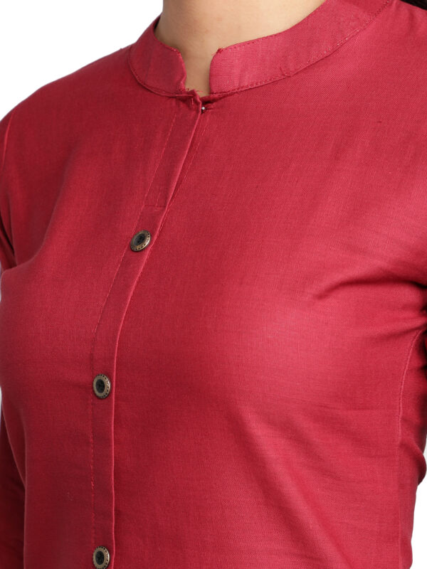 Style : Maroon solid plain front-slit straight kurta Pattern : Front slit, straight hem and button closure