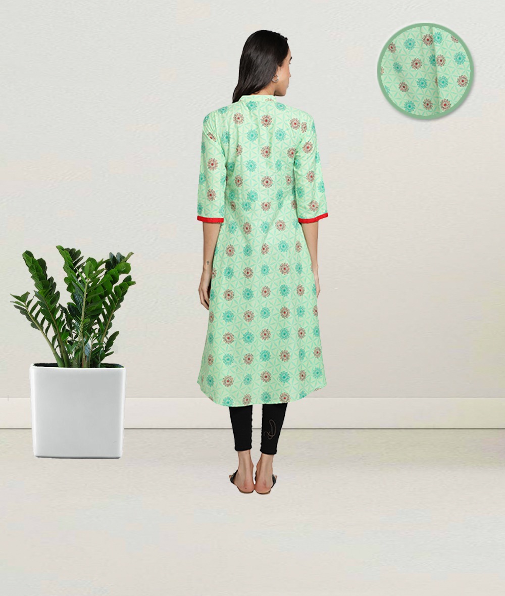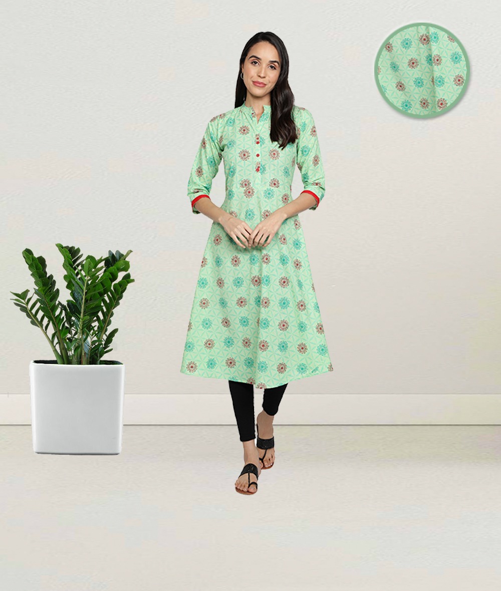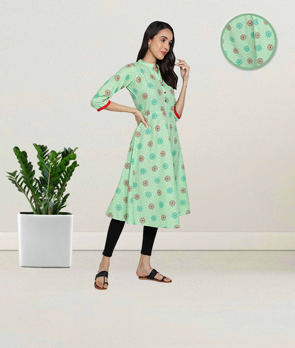 Style : Sea green printed flared cotton kurta Pattern : Flared hem, button closure, trendy print