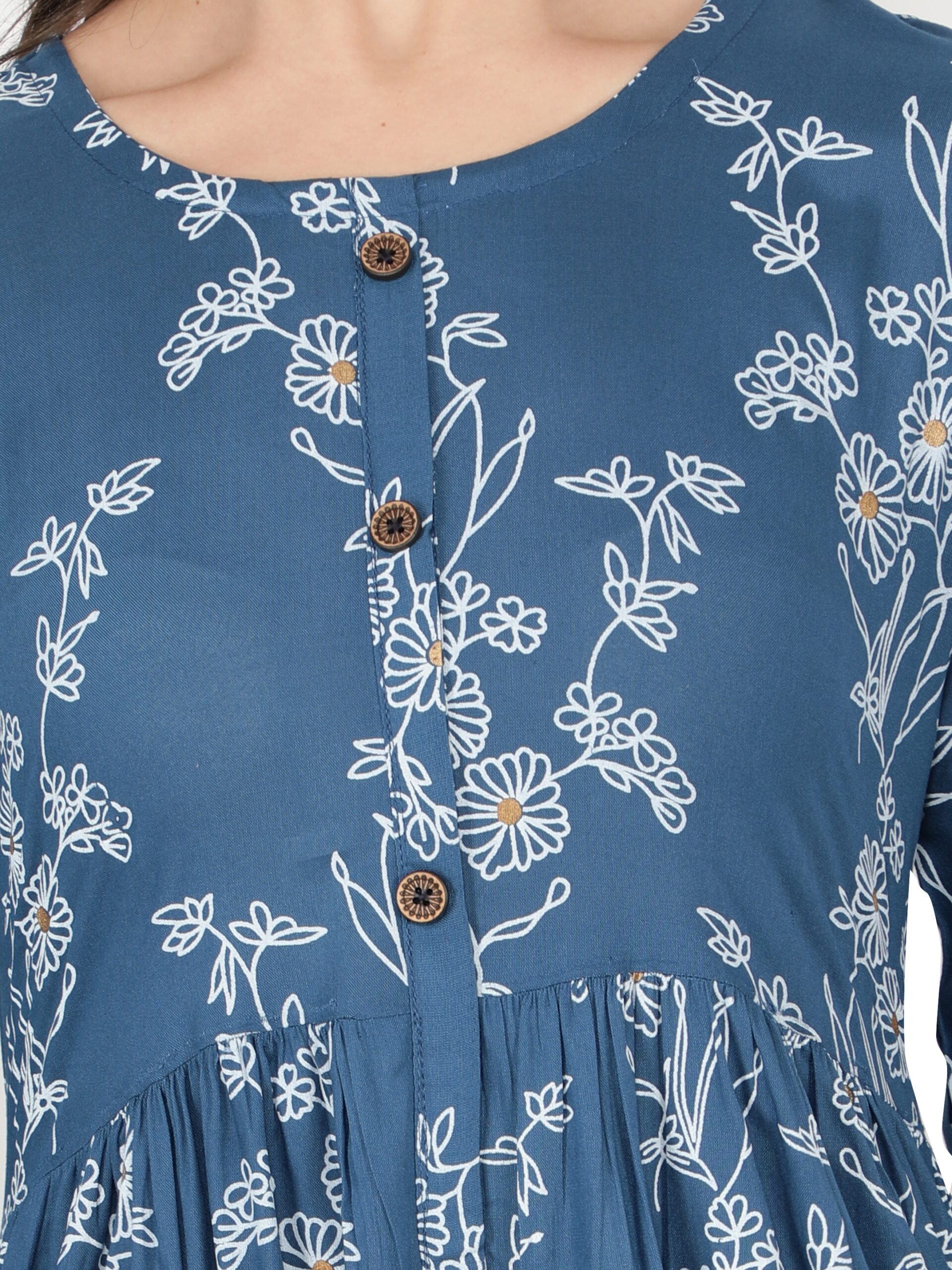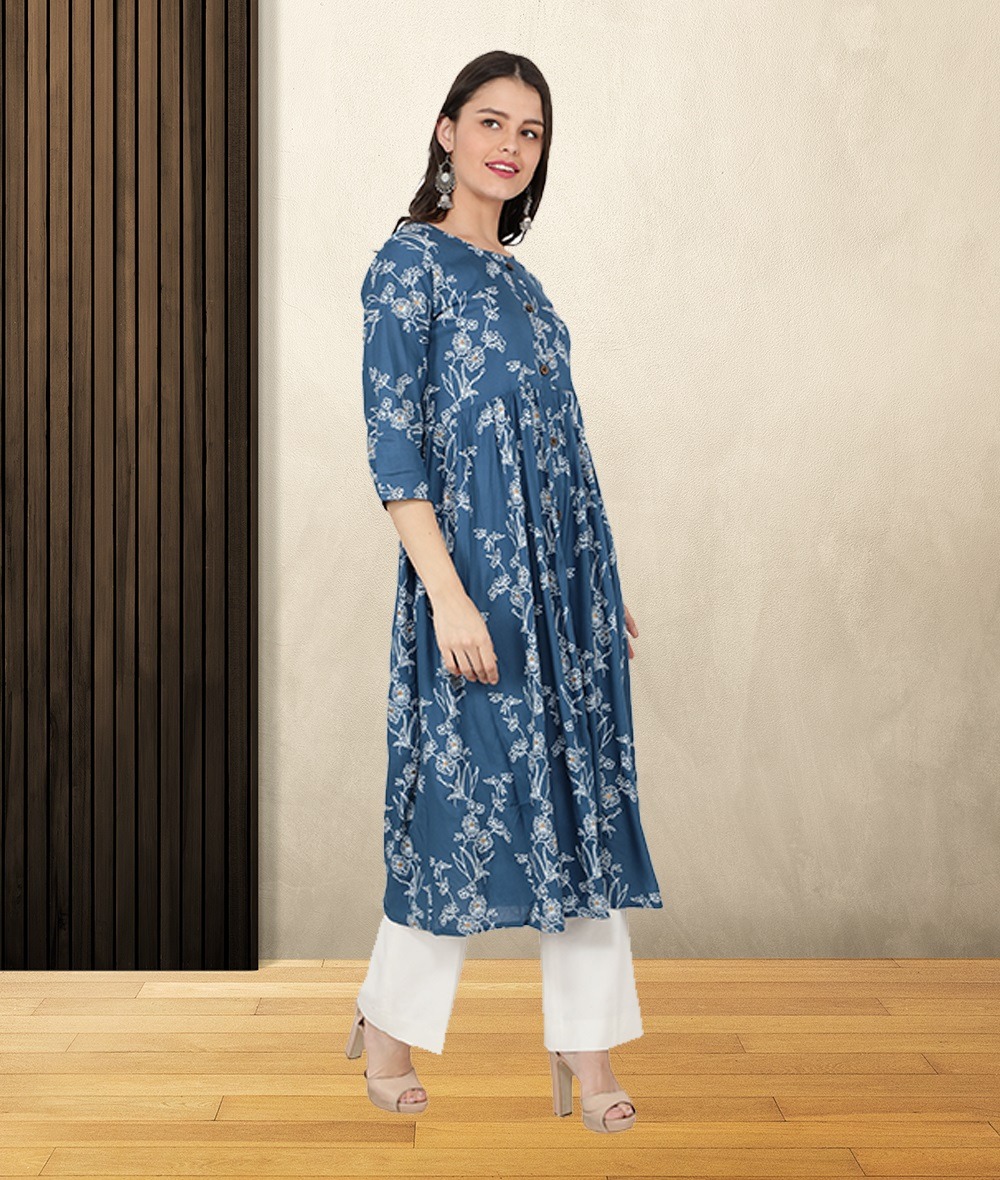 Style : Blue floral printed flared & front-slit kurta Pattern : Flared hem, floral foil print, button closure