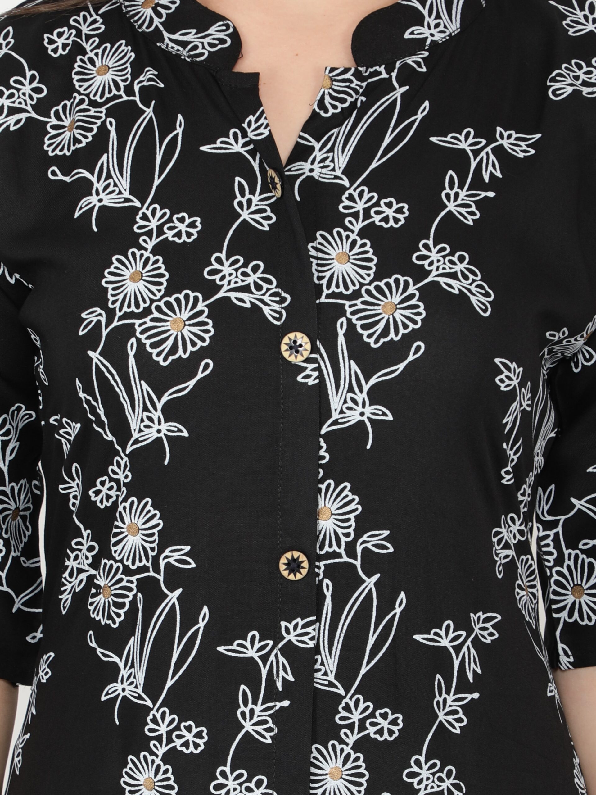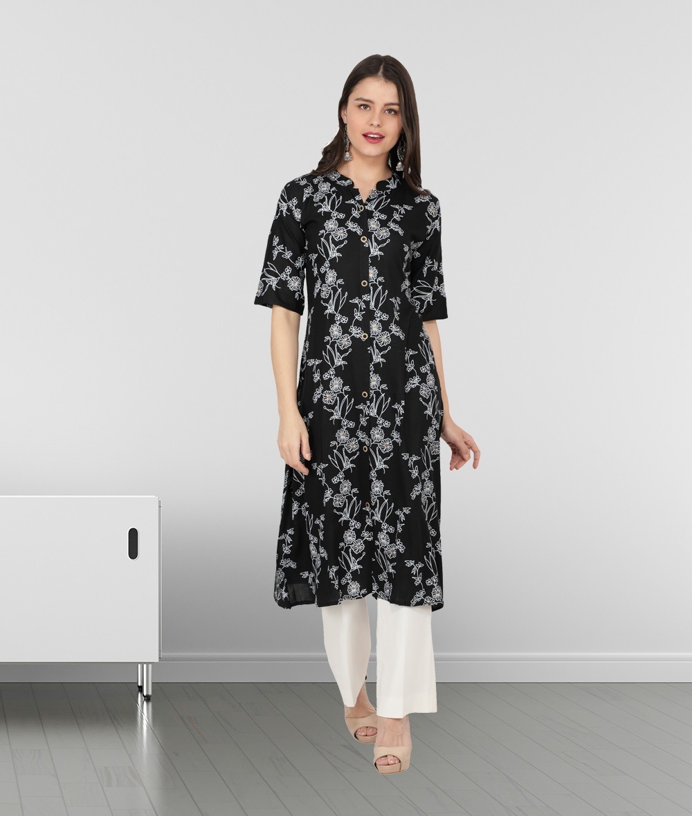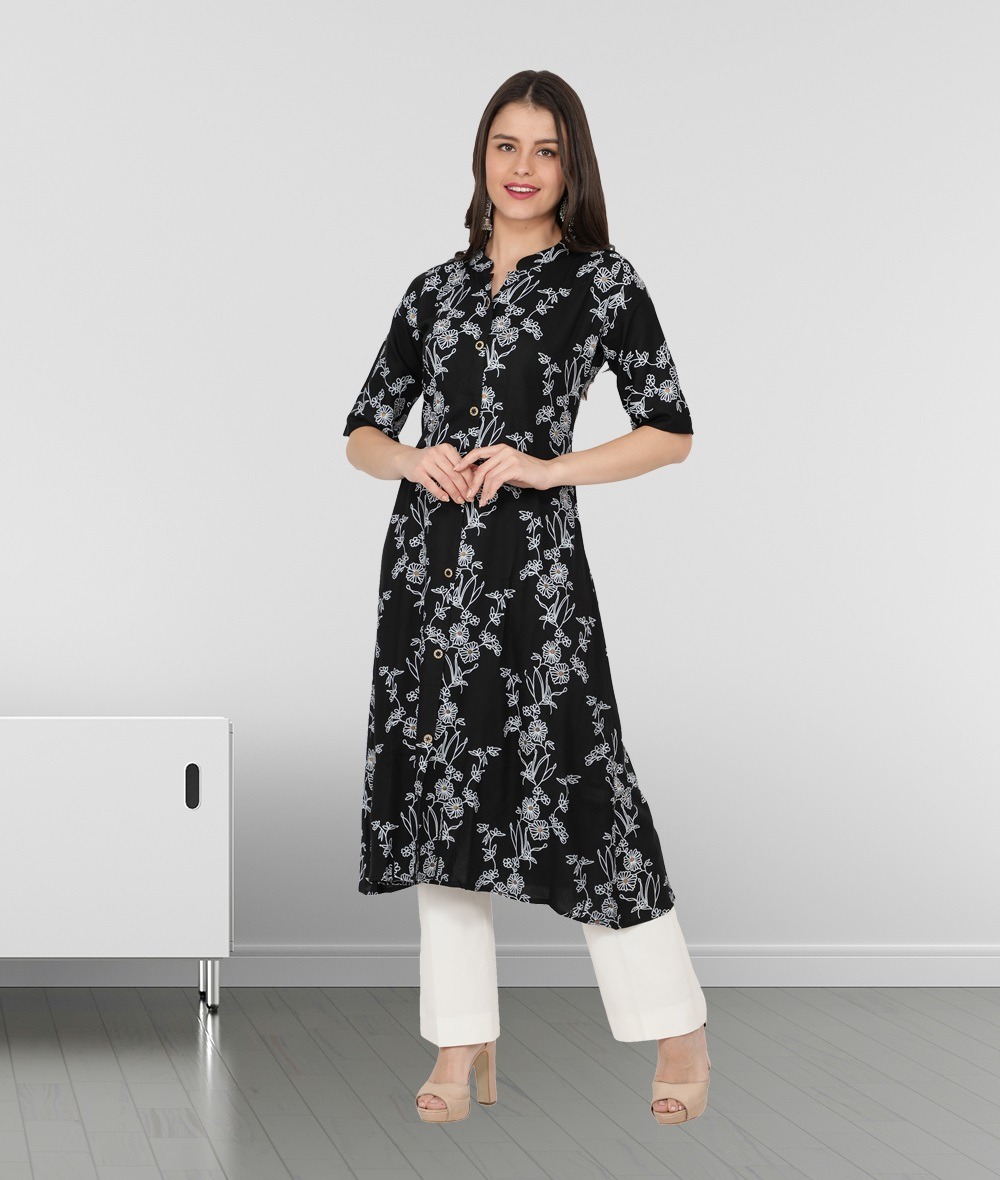 Black kurti from fabclub is made from rayon fabric. Black floral foil printed rayon a-line kurta, has a mandarin collar neck, three quarter sleeves, flared hem, front slit, button closure, length upto 46 inch. This stylish kurti is suitable for festive occasions. Team it with matching leggings or palazzo pant and accessories for a chic look.