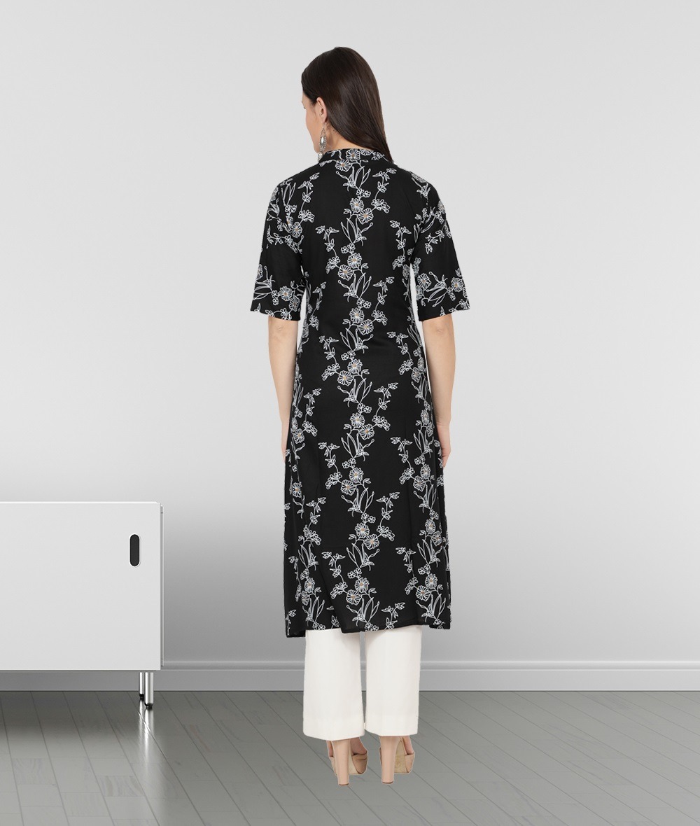 Fabclub Rayon Floral Foil Printed Front Slit A-Line Women Kurti (Black)