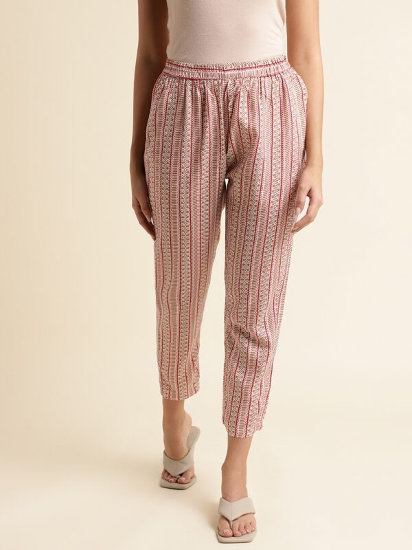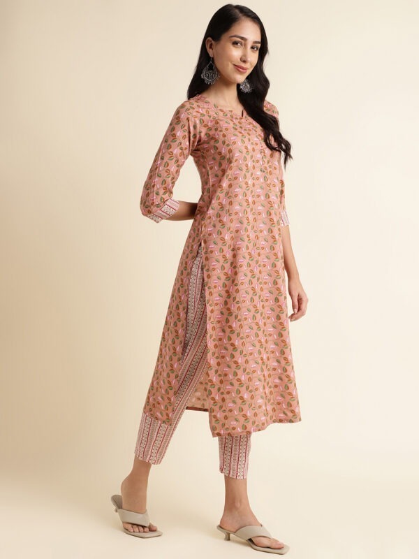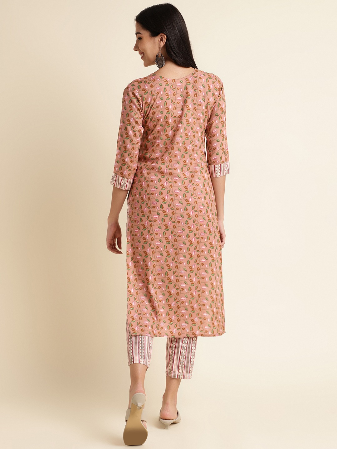 This designer leaf printed kurta set is an epitome of style and comfort from Fabclub. Peach viscose rayon straight kurta, has a three-quarter sleeves, gold foil print, v-neck, straight hem, button closure, and comes with printed trouser pant, has a mid-rise, elasticated waistband with slip-on closure, and regular fit.
