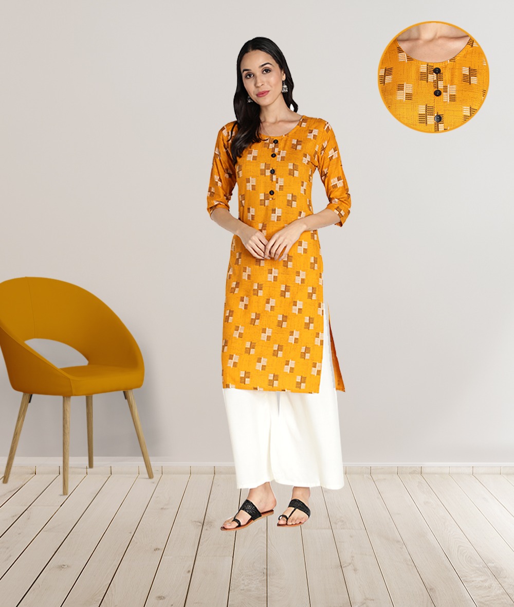 Fabclub Women Rayon Printed Straight Kurti (Mustard Yellow)