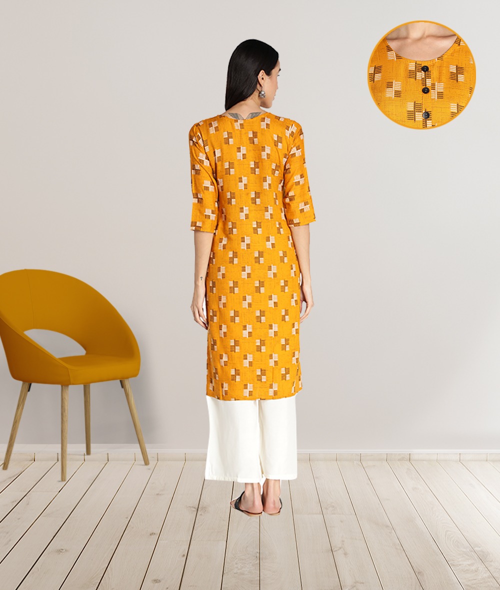 Style : Mustard yellow printed straight kurta Pattern : Straight hem, side slits and button closure