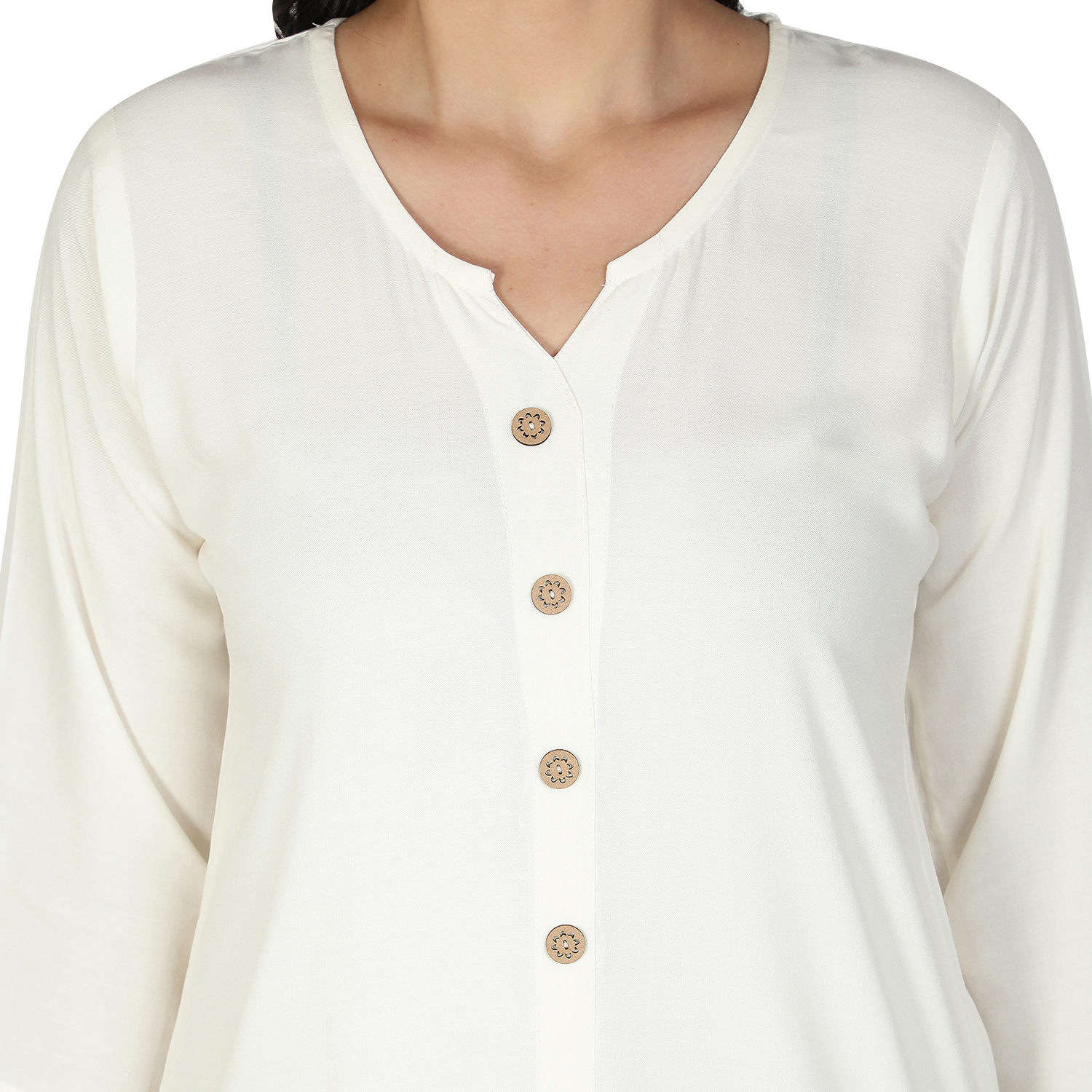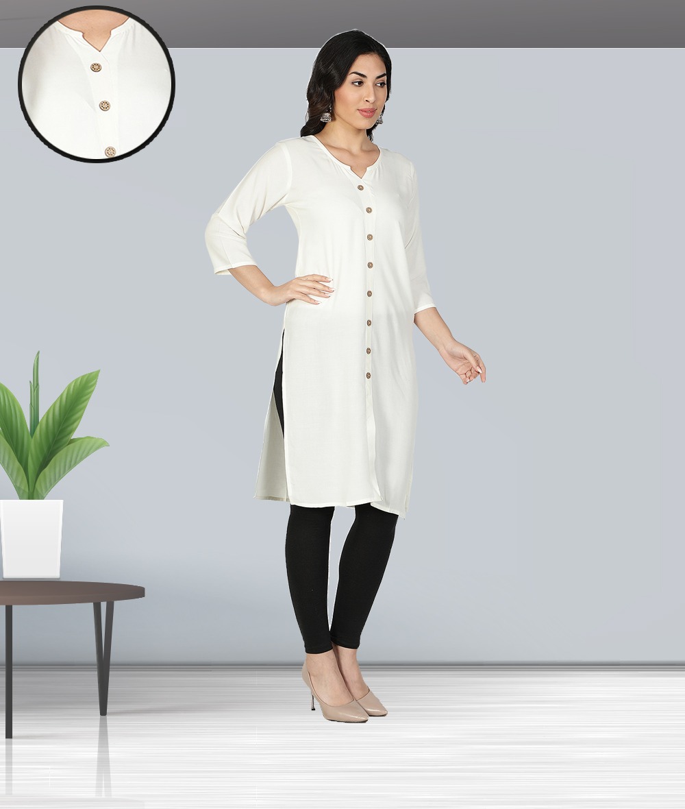 Style : Off White solid plain front-slit straight kurta Pattern : Front slit, straight hem and button closure