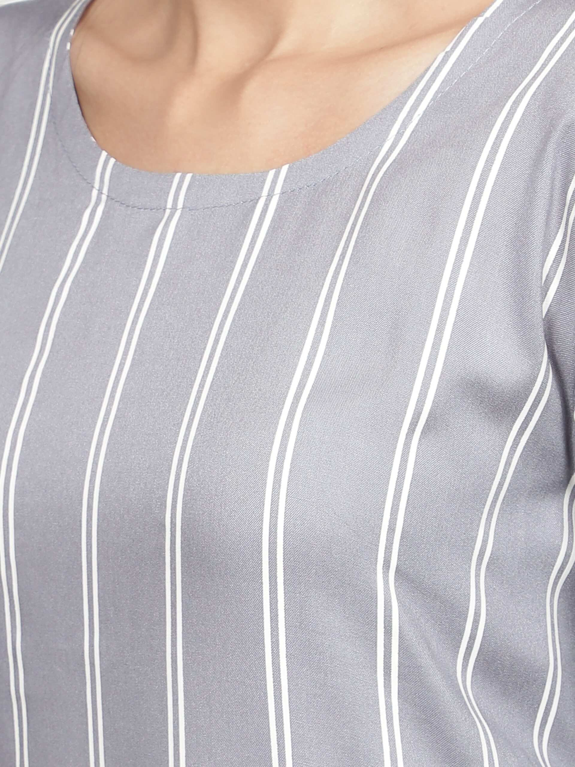 Style : Grey Striped Asymmetric Flared Kurti Pattern : Flared hem, striped designer asymmetric kurta