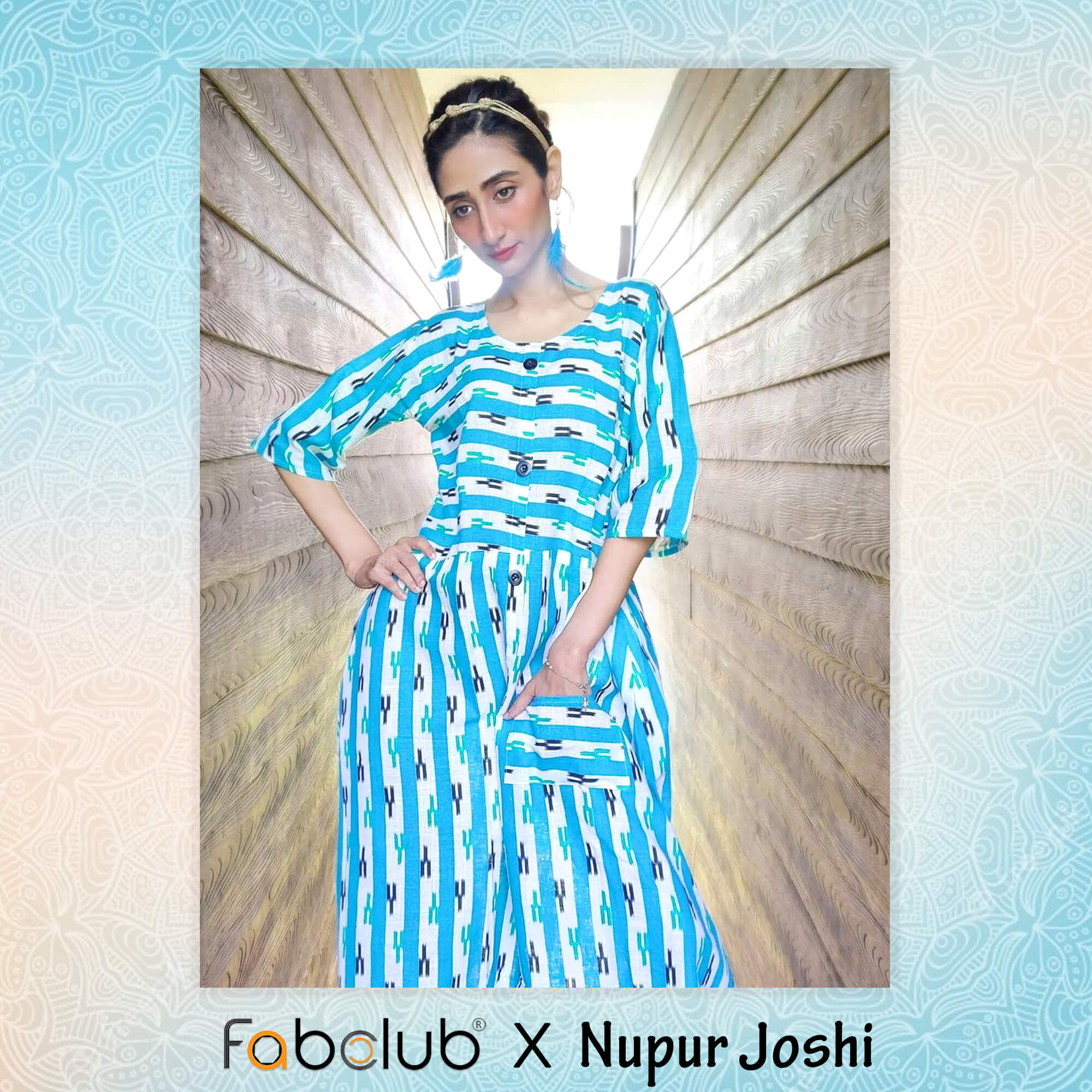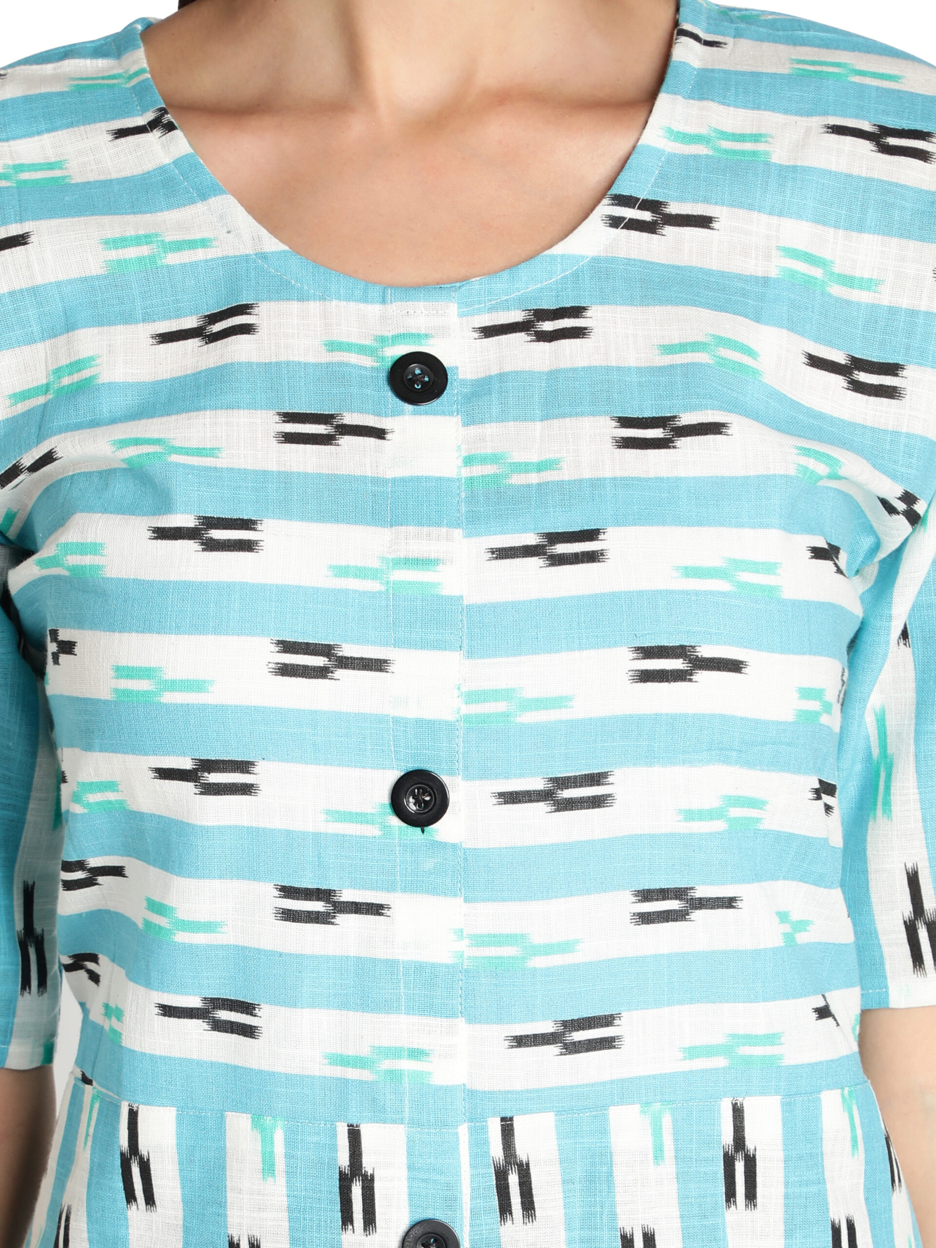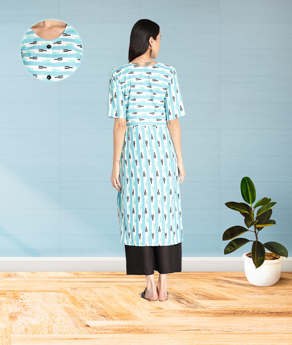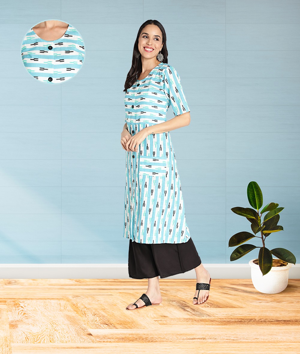 Style : Sky Blue Striped Front Slit A-Line Pocket Kurti Pattern : Flared hem, button closure and 1 pocket