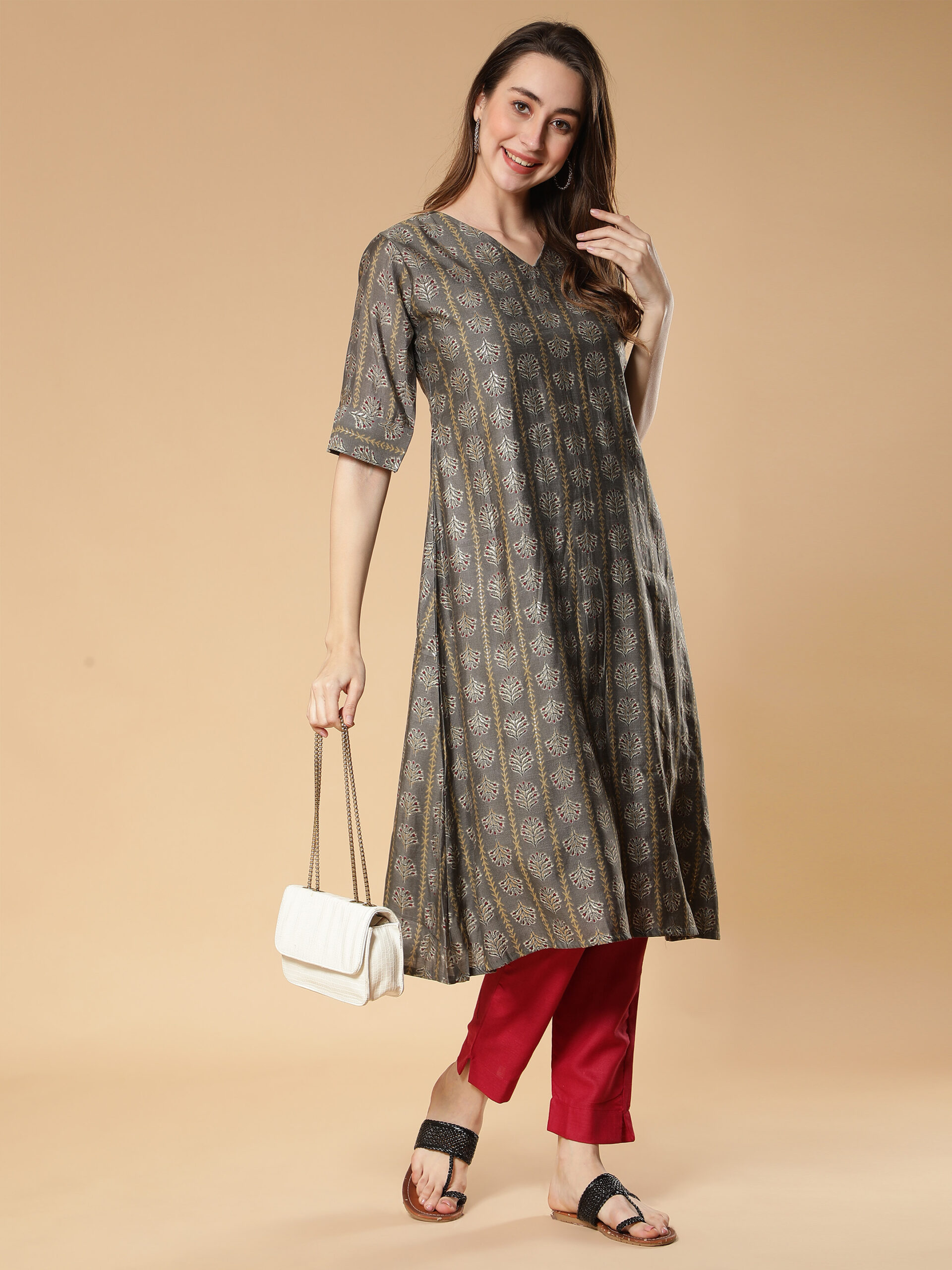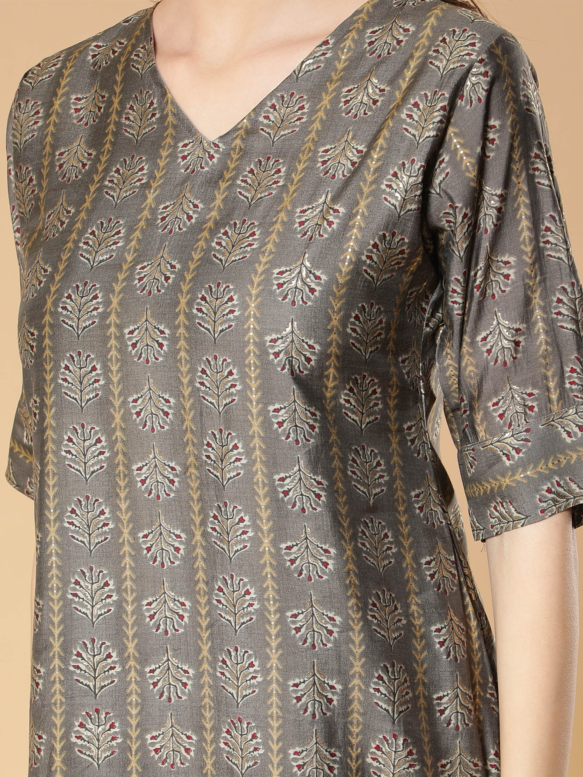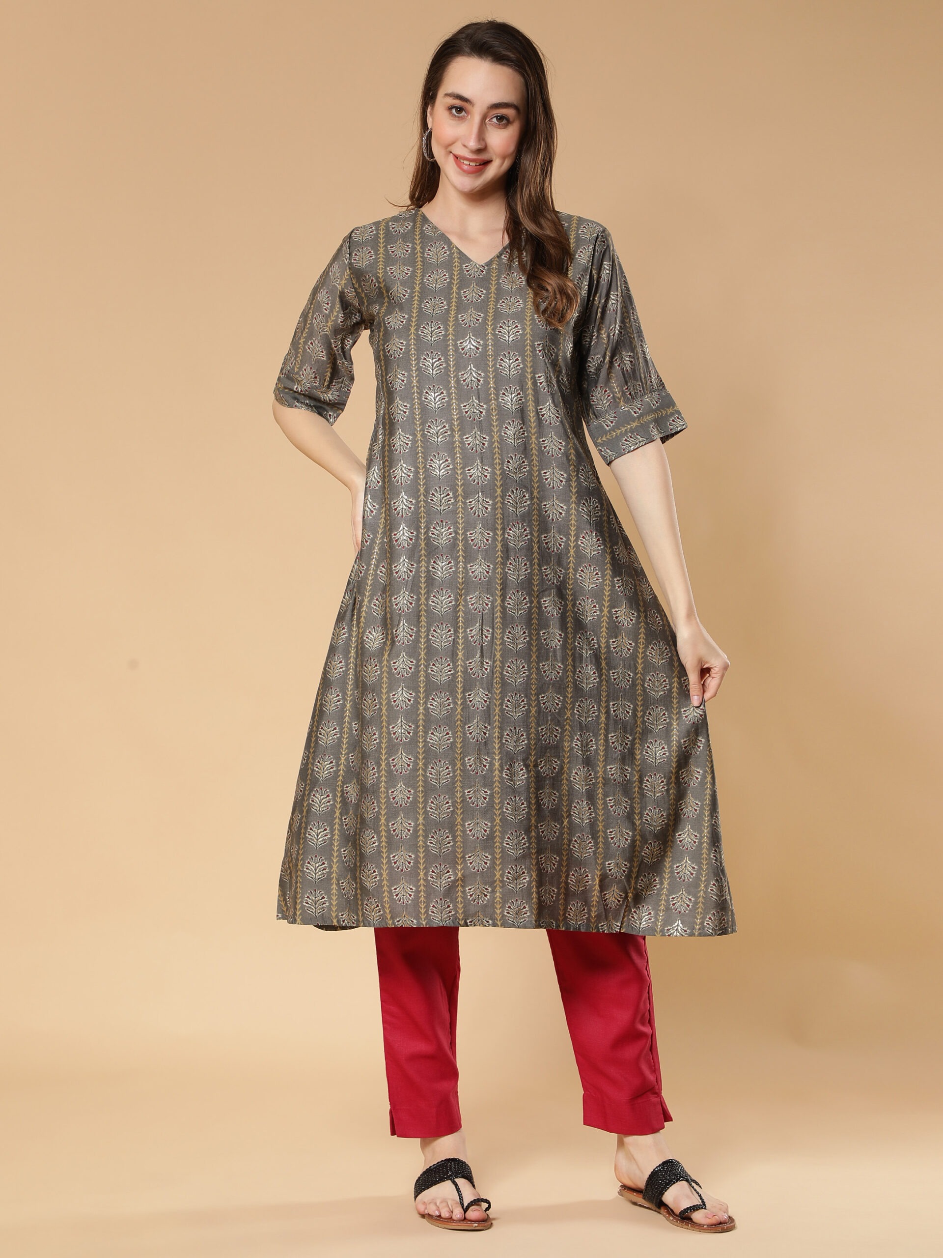 This trendy kurta pant set from Fabclub is suitable for festive occasions. Grey gold foil printed A-Line modal silk designer kurta, has a v-neck, half sleeves, gold print, flared hem, a-line style. Maroon cotton solid plain mid-rise cropped cigarette trouser pant, has a mid-rise, two pockets, partially elasticated waistband with slip-on closure, and regular fit.