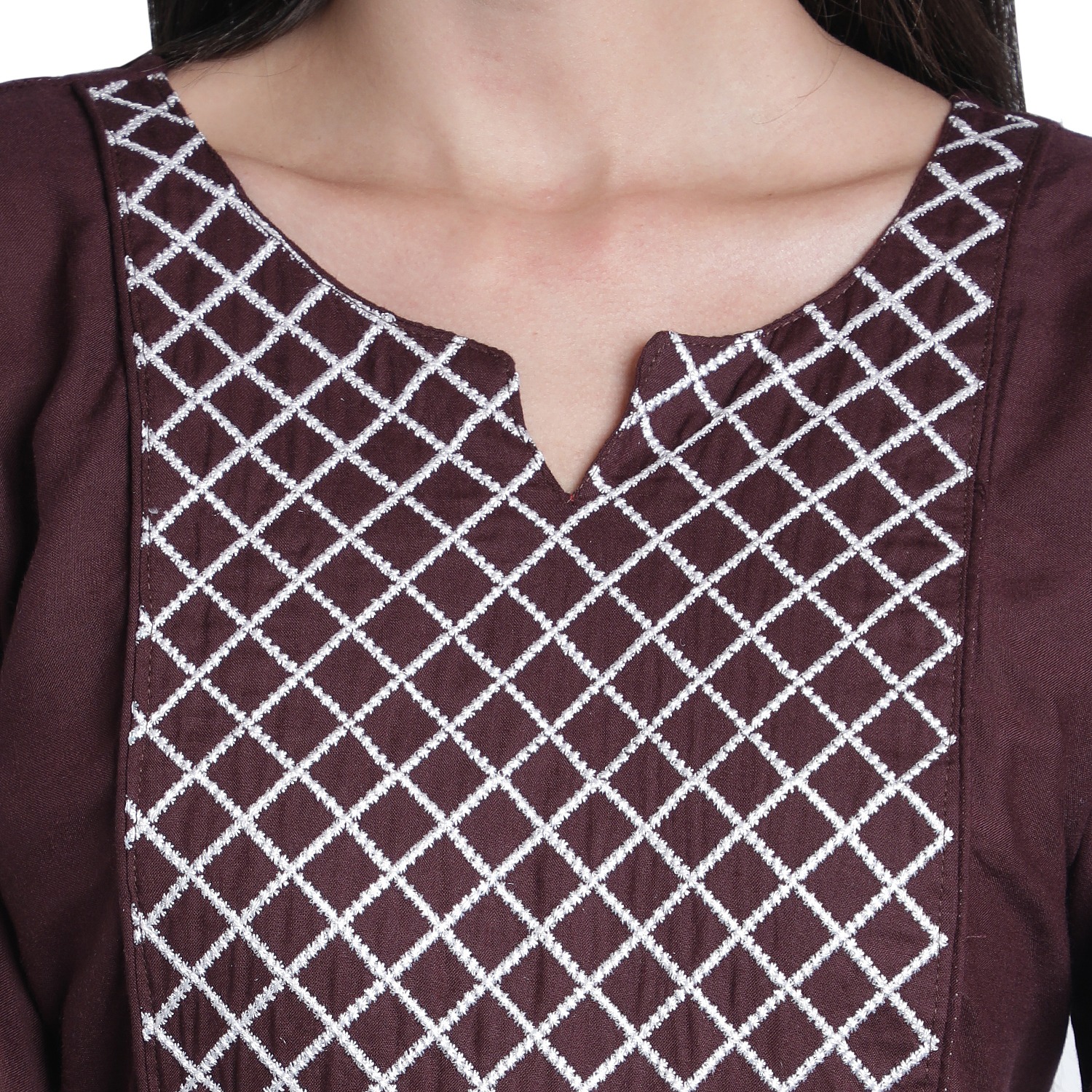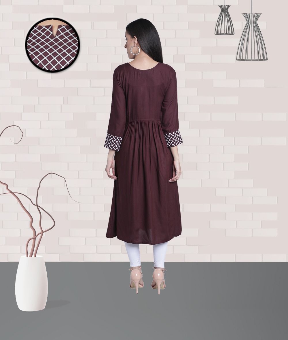 Rayon Checks Embroidered Flared Women Kurti (Brown)