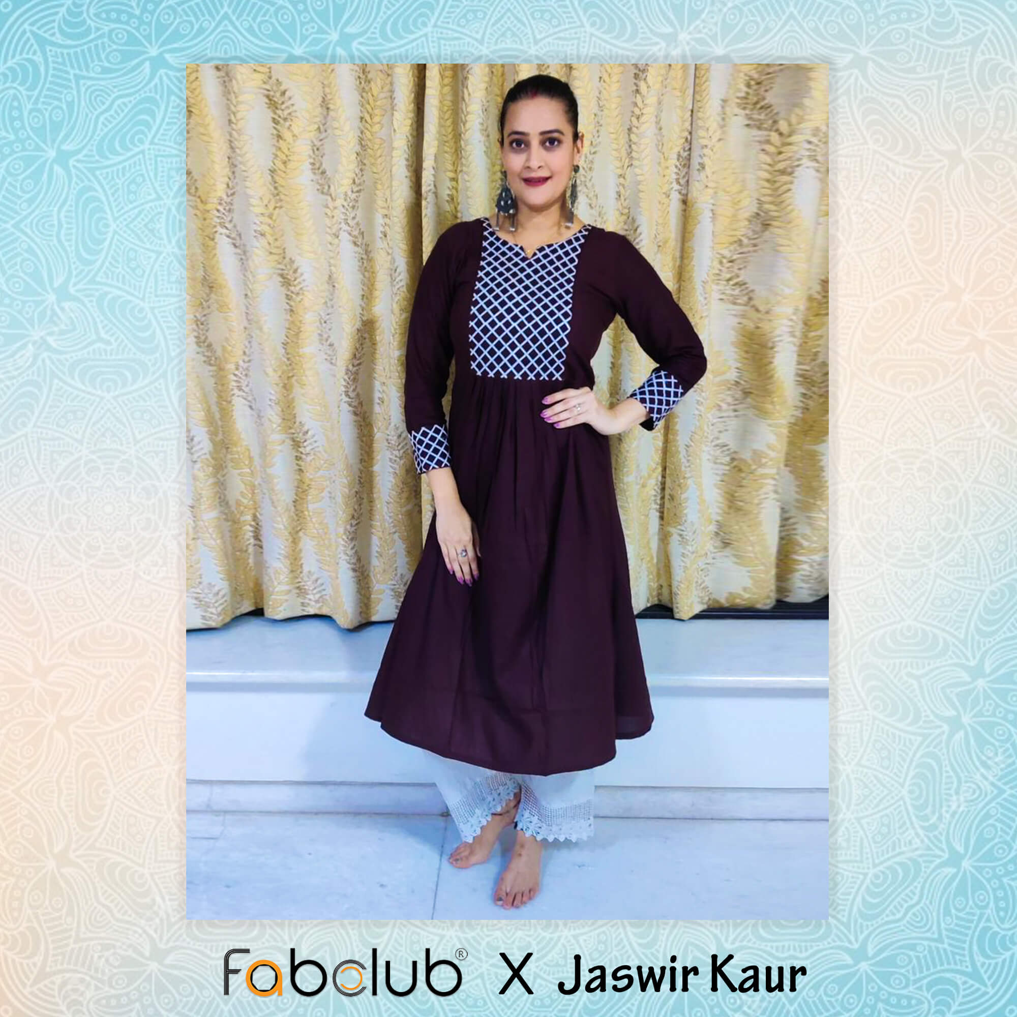 Style : Brown embroidered flared designer kurta Pattern : Checks embroidered yoke detail, flared hem