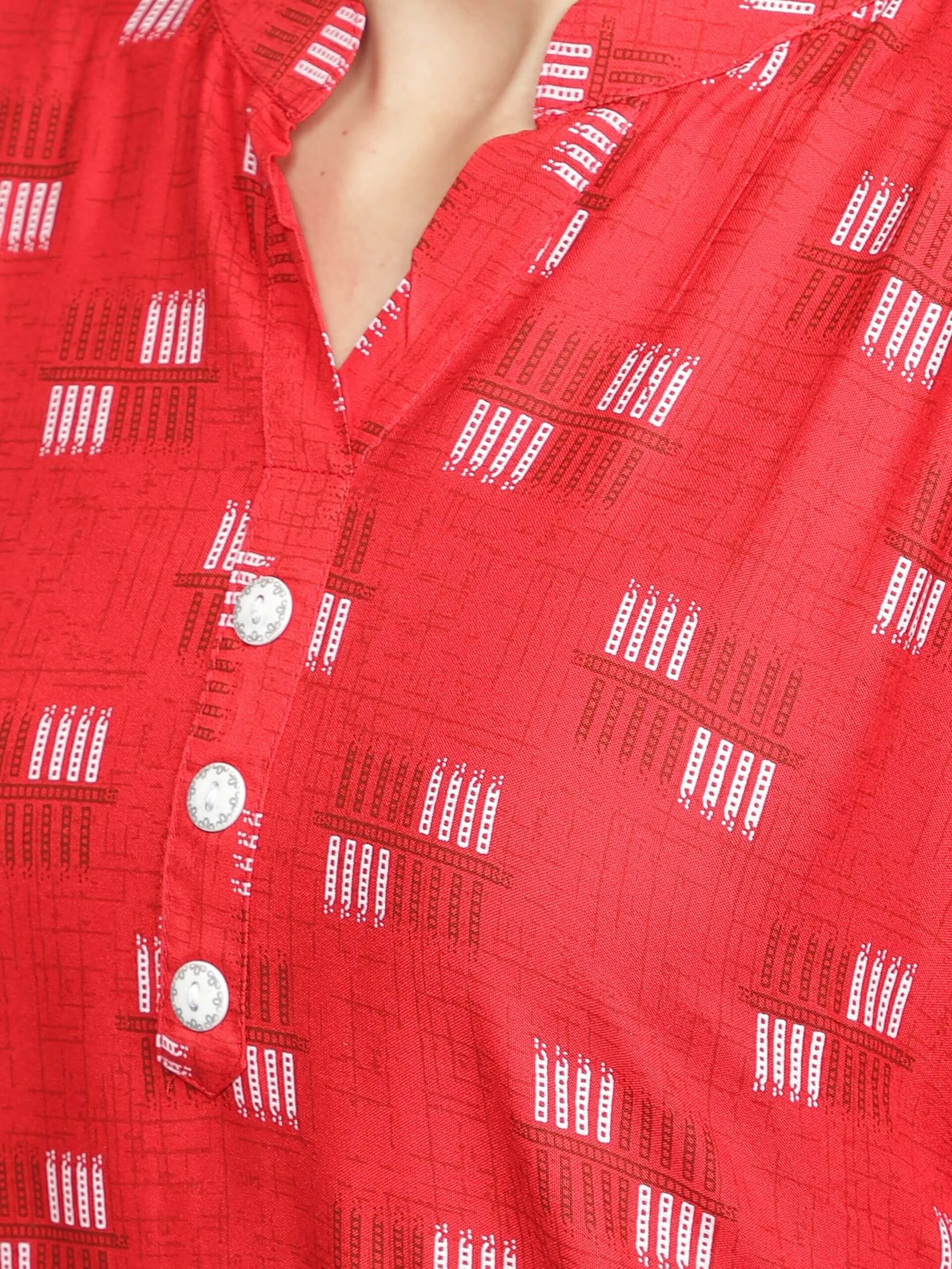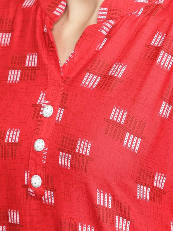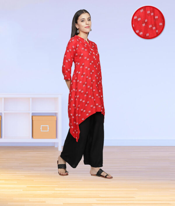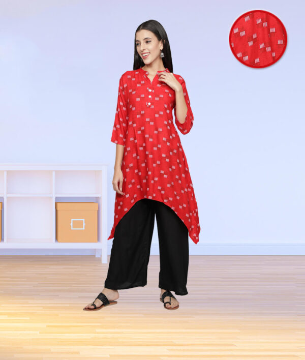 Style : Red printed asymmetric kurta with solid plain black palazzo, Rayon kurta set Kurta design : Printed, asymmetric hem, mandarin neck, three-quarter sleeves, button closure. Palazzo design : Solid plain free size palazzo, elasticated waist band, mid rise, best fits for waist size 28 inches to 38 inches.