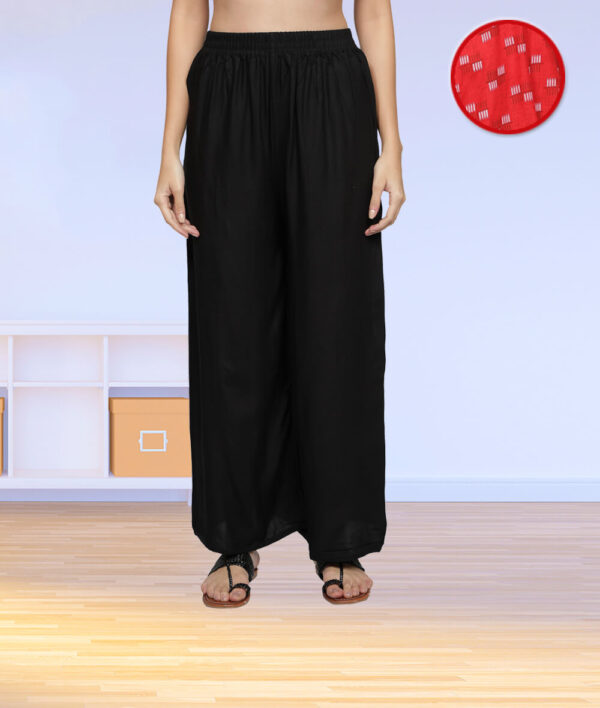 Style : Red printed asymmetric kurta with solid plain black palazzo, Rayon kurta set