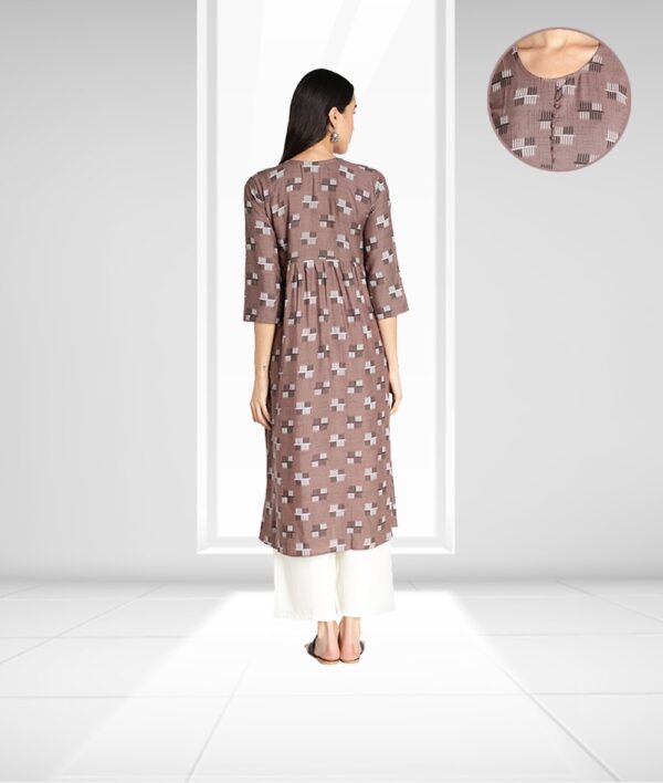 Style : Dusty brown printed flared kurti with solid plain off white palazzo, Rayon kurta set