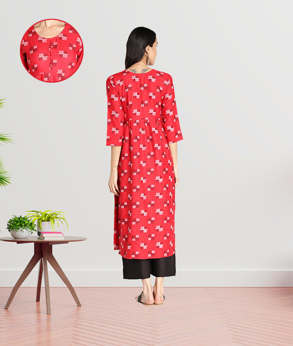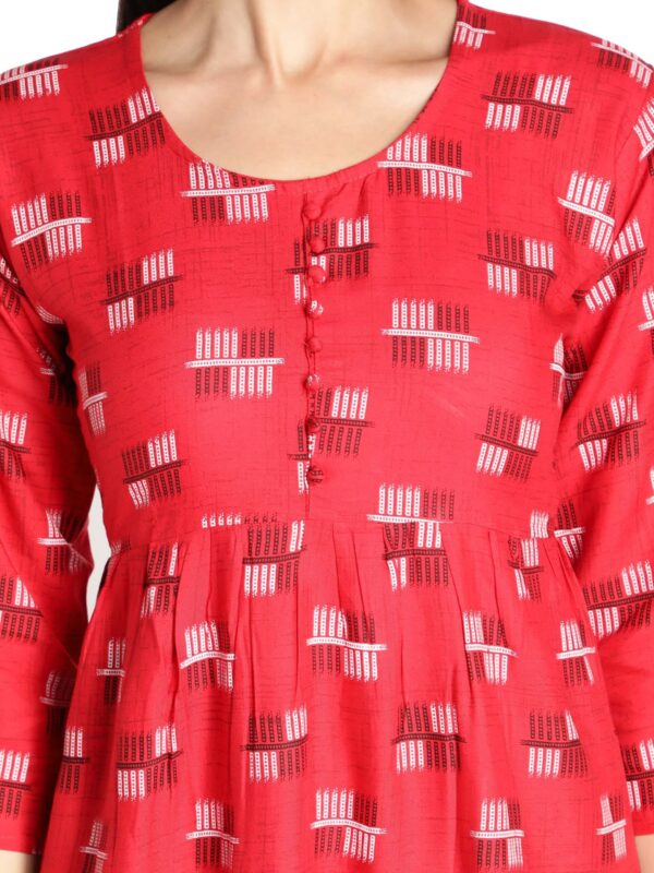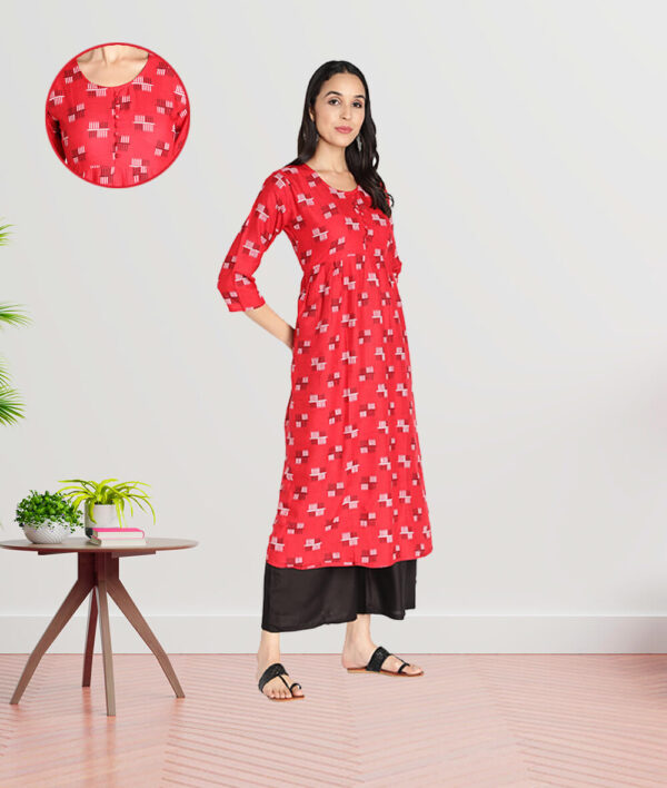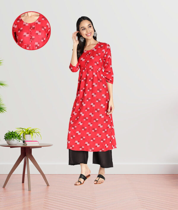 Style : Red printed flared kurti with solid plain black palazzo, Rayon kurta set