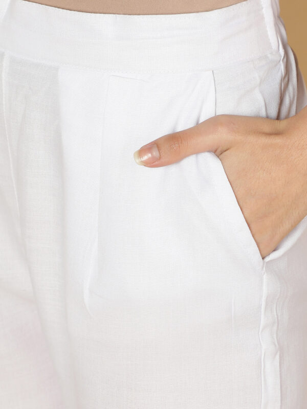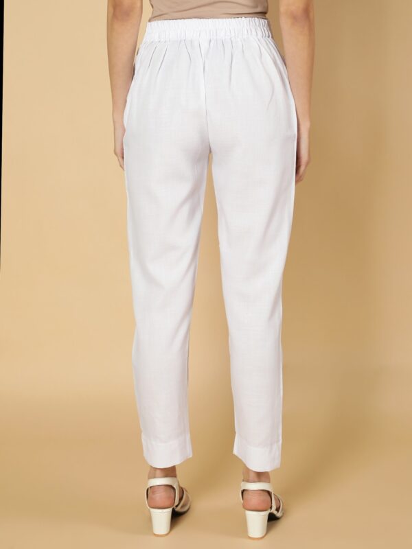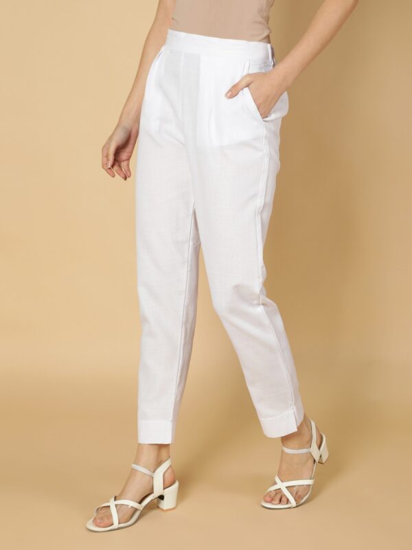 ₹1,299.00₹649.00White Solid Plain, Two Pockets, Ankle Length, Straight Cigarette Cotton Trouser Pant
