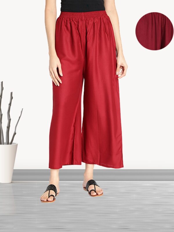 ₹1,199.00₹599.00Women’s Heavy Rayon Solid Plain Free Size Palazzo (Maroon)