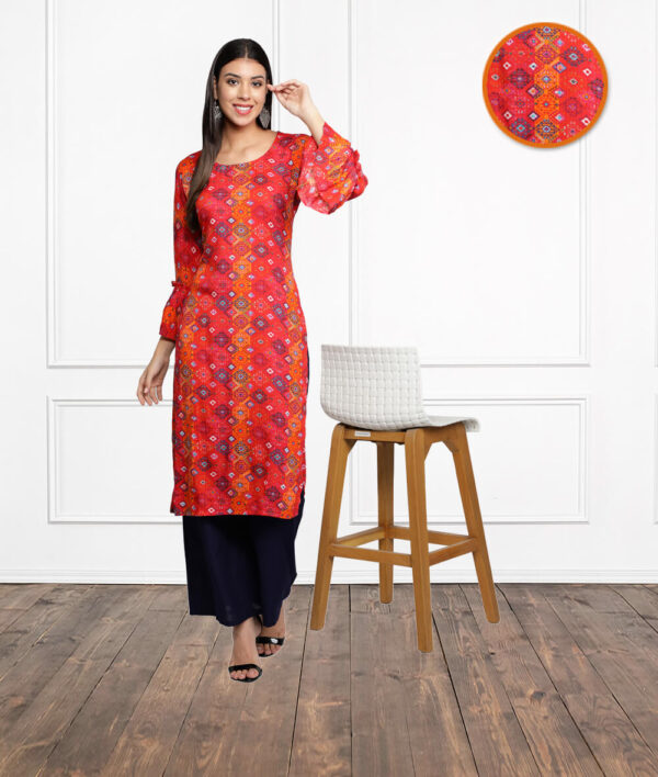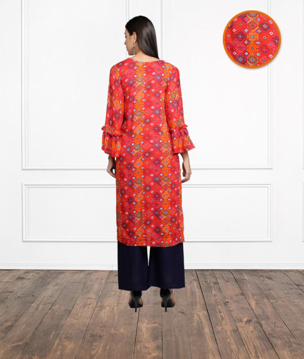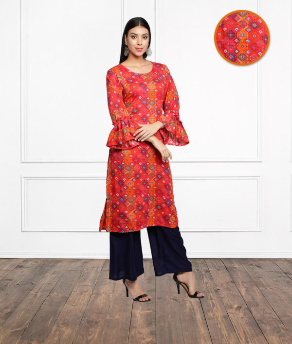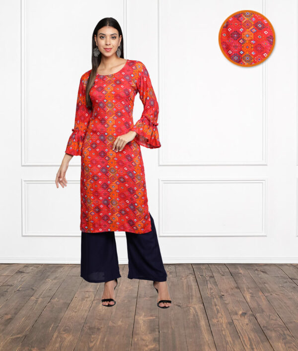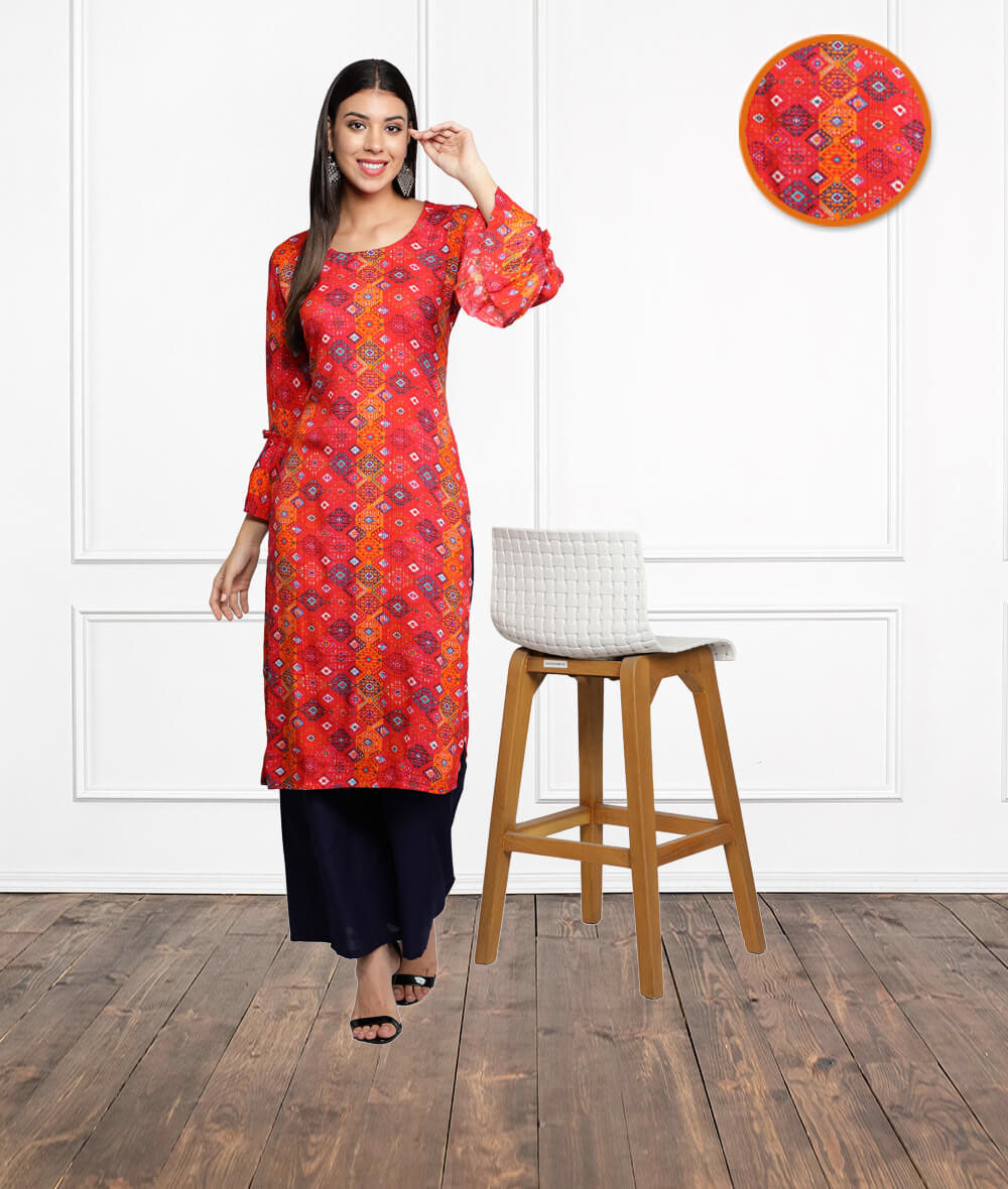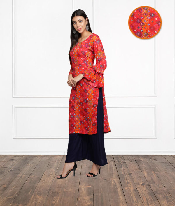 ₹899.00Women Rayon Printed Asymmetric Kurti With Palazzo (Red)