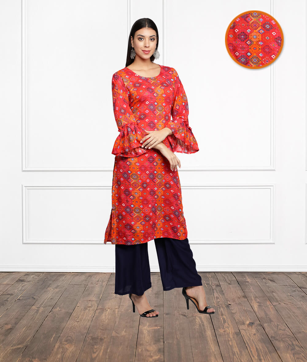 Kurta design : Bell flared sleeves, ethnic motif print, round neck, side slits, straight hem.