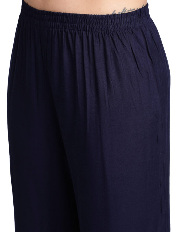 Style : Pink printed straight kurta with solid plain navy blue palazzo, Rayon slub kurta set
